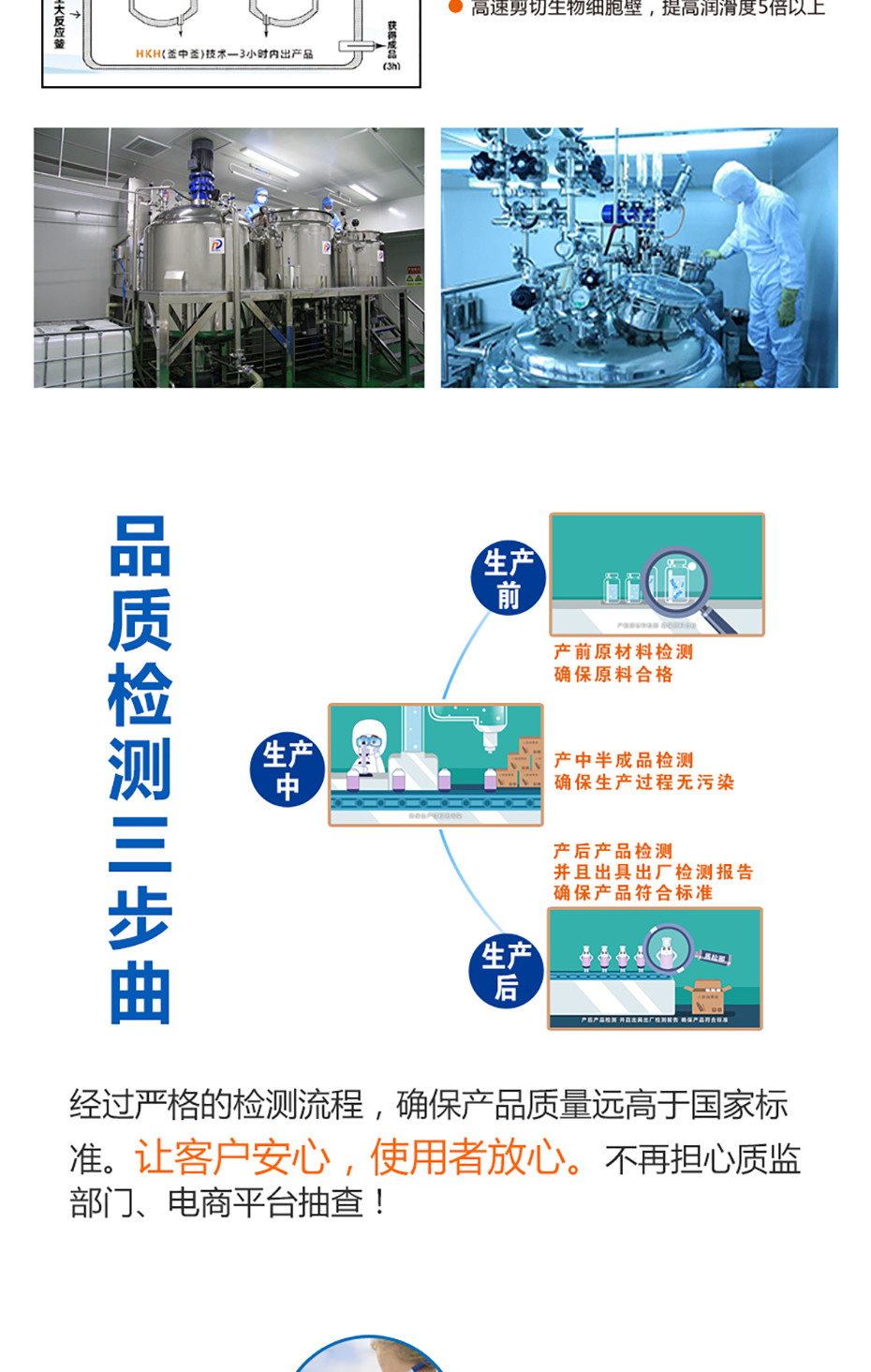 嚴(yán)謹(jǐn)出精品!嚴(yán)格按照GMP生產(chǎn)規(guī)范!生產(chǎn)前原材料檢測,確保原料合格。生產(chǎn)中半成品檢測,確保生產(chǎn)過程無污染。生產(chǎn)后產(chǎn)品檢測并且出具出廠檢測報告,確保產(chǎn)品符合標(biāo)準(zhǔn),從原料到成品層層把關(guān),確保每一件均為精品。不怕被質(zhì)監(jiān)部門、電商平臺抽檢!