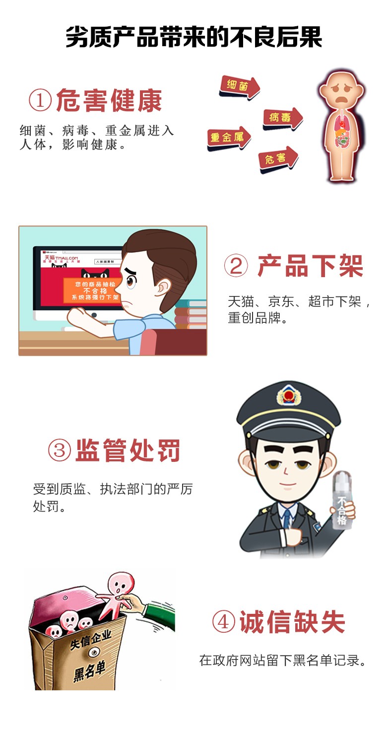 嚴(yán)謹(jǐn)出精品!嚴(yán)格按照GMP生產(chǎn)規(guī)范!生產(chǎn)前原材料檢測,確保原料合格。生產(chǎn)中半成品檢測,確保生產(chǎn)過程無污染。生產(chǎn)后產(chǎn)品檢測并且出具出廠檢測報(bào)告,確保產(chǎn)品符合標(biāo)準(zhǔn),從原料到成品層層把關(guān),確保每一件均為精品。不怕被質(zhì)監(jiān)部門、電商平臺抽檢!